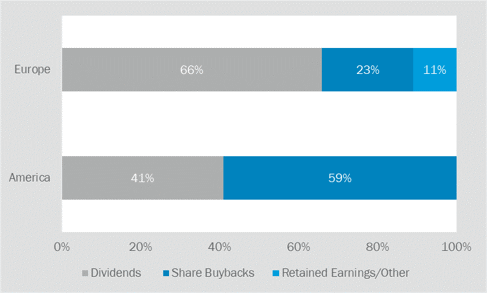 By contrast, European corporations distributed 66% of profits on average as dividends and only 23% as share buybacks in 2019, according to The Economist1. As a result, the larger portion of profit distribution in the form of dividends has led to significant dividend cuts in Europe in 2020 relative to the U.S.