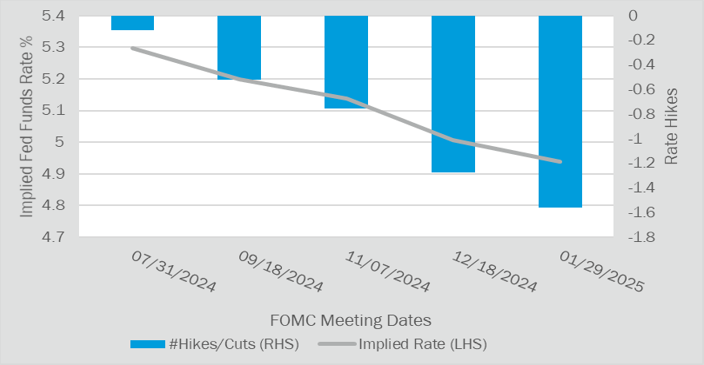 At the end of 2023, the Fed expressed concern about prolonged high interest rates. This “dovish” pivot resulted in the market pricing in six 25 basis point rate cuts in 2024. However, over the last five months, positive economic growth and persistent inflation has prompted the Fed to reconsider. As of early June 2024, the market now anticipates approximately one and a half rate cuts. FOMC members continue to reiterate a restrictive monetary policy and the ability to sustain higher interest rates for an extended period.