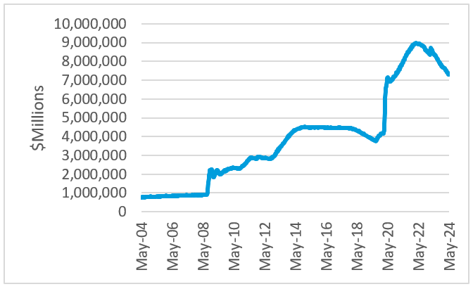 In May 2024, the Fed announced that they would reduce the monthly roll-off of Treasuries from $60 billion to $25 billion while retaining the roll-off of mortgage-backed securities (MBS) at $35 billion[3]. The gradual pace of balance sheet roll-offs introduces a more expansive liquidity environment. Although the target level for the Fed’s balance sheet remains unknown, the decision to slow the pace of bond maturities will keep the balance sheet well above the pre-pandemic level of $4.2 trillion.