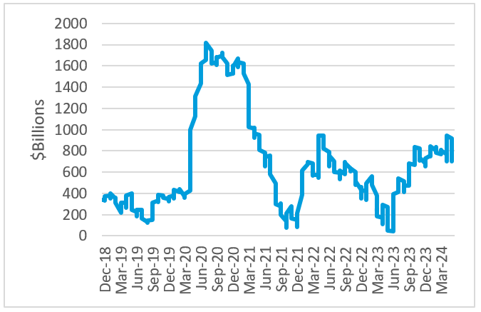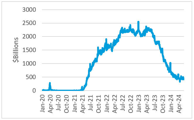 The RRP peaked at approximately $2.5 trillion in late 2022 as the facility absorbed excess market liquidity from prior COVID-19 stimulus measures. As the U.S. Treasury began issuing debt in the summer of 2023, excess liquidity via RRP declined to accommodate the new supply of treasury bonds entering circulation. Moreover, the Fed’s balance sheet reduction, with bond roll-offs (i.e., maturing) amounting to $95 billion per month, contributed to the decline in the RRP. The facility fell to $440 billion by the end of May 2024.