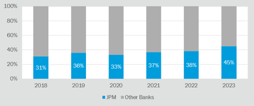 Additionally, major financial institutions are investing heavily in AI capabilities and research. According to recent reports, between 2017 and 2022 Wall Street’s largest banks filed roughly 90% of AI-related patents, published two-thirds of AI research papers, and accounted for half of AI investments in the sector[8]. JPMorgan Chase, for instance, is projecting the firmwide technology spend to be roughly $17 billion for 2024, up $1.5 billion year-over-year, with a significant portion dedicated to AI and machine learning initiatives[3]. The firm is also continuing to spearhead the AI research landscape, accounting for 45% of all research published by financial institutions in 2023, up from 31% in 2018[4].