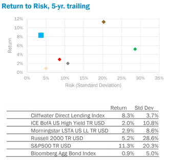 Private credit has the potential to improve portfolio risk-adjusted returns with lower correlation to other asset classes. Over a five-year period, private credit (as demonstrated through the Cliffwater Direct Lending Index) has provided better risk-adjusted returns and lower correlation to other public asset classes.