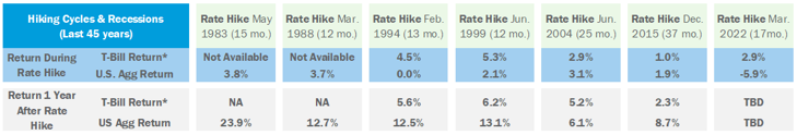 T-Bill returns performed better than the U.S. Aggregate during a rate hiking cycle, however U.S. Aggregate returns meaningfully outpaced T-Bill returns one year after the Fed Funds rate peaked.