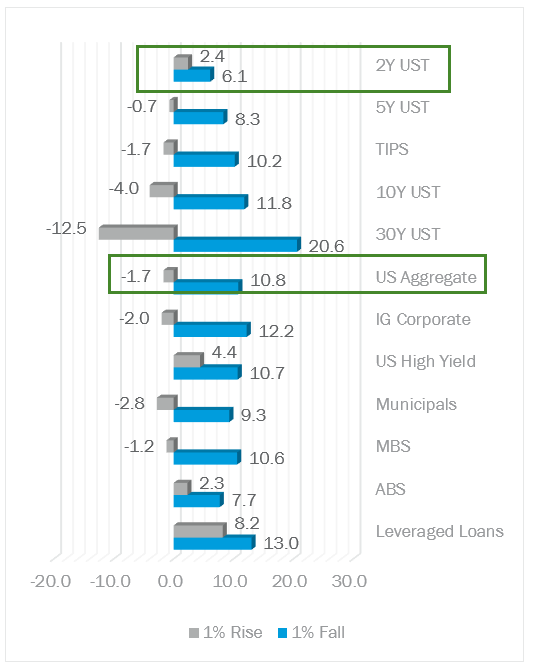 Considering the level of current yields, a 1% decrease in interest rates has a more substantial impact on returns than a 1% increase in interest rates. Every incremental move higher in interest rates has less of an effect on outstanding bond prices given higher base rates relative to years prior. Moreover, long-duration fixed income presents an asymmetric potential for positive returns if interest rates were to decline.