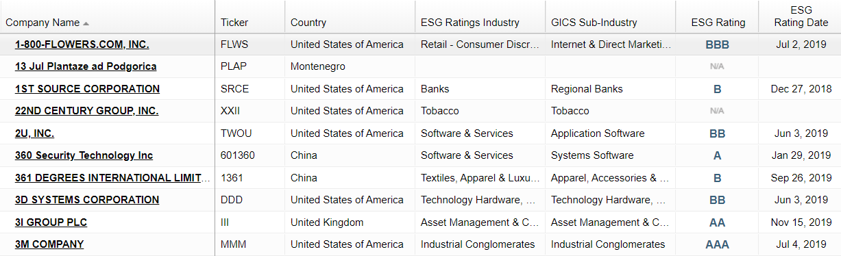 Using MSCI ESG Manager, we can also produce a report on the individual companies within a custom portfolio or passive benchmark with each company’s ESG ratings. A sample of this report is shown below.