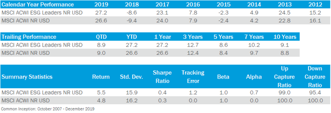 Investors can also passively invest in ESG-integrated indices, such as MSCI ACWI ESG Leaders. These types of indices tend to have static methodologies that overweight and underweight traditional index constituents based on their underlying ESG ratings. While performance can vary depending on different periods, the MSCI ACWI ESG Leaders Index has outperformed the traditional MSCI ACWI on a risk-adjusted basis over the last 10 years: