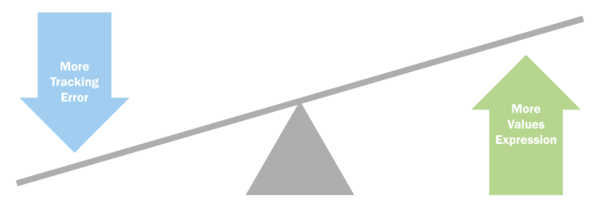 Lastly, investors can implement a values-based approach to their passively-managed exposure by optimizing portfolio construction based on tracking error (i.e. the difference in portfolio returns relative to the difference in benchmark returns). Investment managers can overweight, underweight, or exclude companies based on a client’s ESG preferences while minimizing the difference in return between the portfolio and the relevant benchmark. The higher the tracking error budget, the more flexibility a client has to express their values within the portfolio.