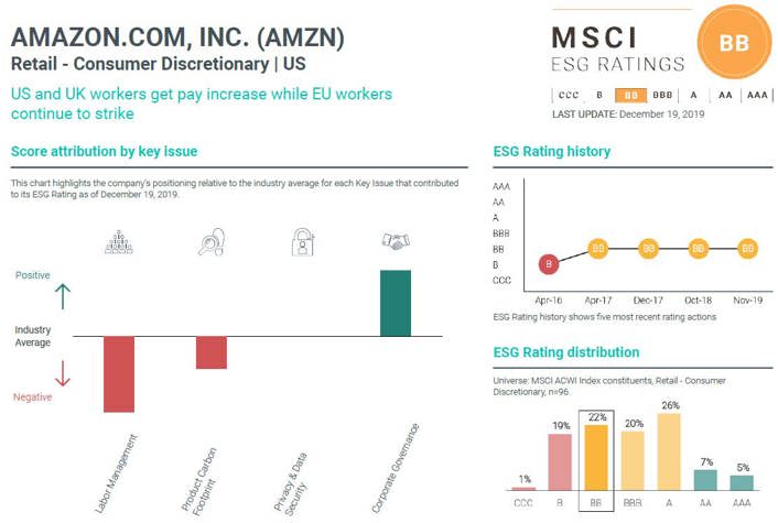Moreover, ESG characteristics for individual companies can be analyzed relative to industry peers on a more granular level. The additional insight can help determine whether a large portfolio holding should be overweight or underweight relative to the benchmark-based ESG scoring, all else being equal. The company, Amazon, is used as an example in Exhibit B.