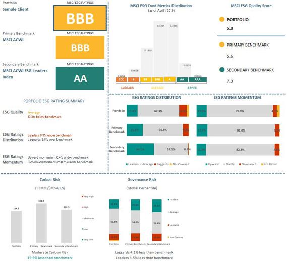 A sample of the MSCI ESG Portfolio Summary Report (Exhibit A) compares an investor’s ESG characteristics to that of a traditional and/or ESG-oriented benchmark. ESG ratings are based on letter grades, from AAA (highest rating) to CCC (lowest rating). The report displays the following characteristics of a portfolio: