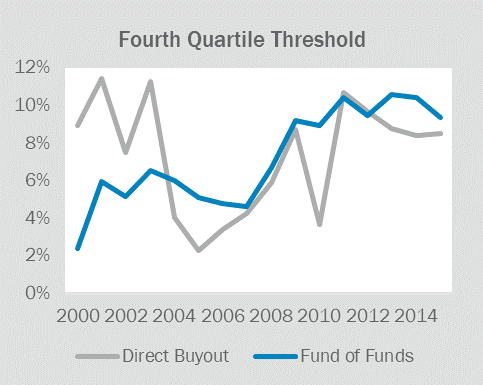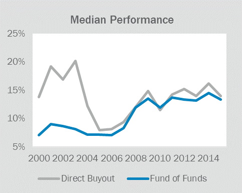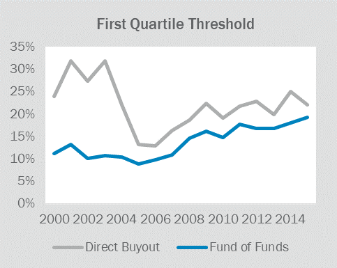 An analysis of PitchBook data indicated that median returns for direct buyout funds have been consistently higher than for fund of funds. Although the gap has closed somewhat for recent vintage years, this is in part due to the earlier stage of the funds. A more significant difference is noticed when analyzing the threshold for first quartile funds, as fund of funds display less upside as a result of high diversification and a double layer of carried interest capping returns. The fourth quartile threshold has been higher for fund of funds in recent vintage years due to downside protection from diversification.