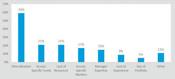 There are several reasons why investors utilize fund of funds to obtain private equity exposure. The graph below shows the most cited reasons for investing in a private equity fund of funds.