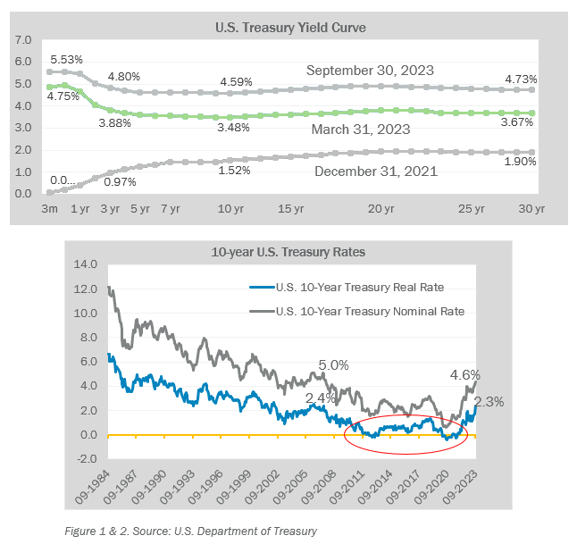 Eighteen months after the first federal funds increase in March 2022, the U.S. Treasury yield curve has shifted meaningfully along all maturities. The inverted yield curve was seen as a harbinger of a potential recession, but the economy continued to do well as global supply chains reopened and pent-up demand for travel and services drove higher levels of economic activity. Despite higher prices across most industries, companies were able to relieve supply shortfalls, the labor market has remained tight, and corporate earnings have come through for many companies. The Fed's resolve to keep rates "higher for longer" to reach the 2.0% inflation target has pushed up longer-term interest rates, including 10-year and 30-year rates, more prominently in recent months, making the yield curve less inverted but at higher absolute rate levels. Some of the volatility seen this year in growth equities, real estate, and long-duration bonds reflects the changing cost of intermediate to long-term capital. At 4.6% nominal and 2.4% real, the 10-year Treasury rate remains low relative to history, but the recent moves may signal an end to the nearly 15 years of QE-driven low nominal and sub 1% real rates. If persistent, higher real rates of borrowing have the potential to shift the risk-reward dynamics for longer-duration investments, and the challenge for the Federal Reserve is the lag time between implementing higher rates and seeing its actual effect through reported inflation numbers. Usually, by the time they see unemployment rise as a sign to reduce rates, we may already be in an economic slowdown or actual recession.