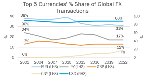 One standout example of an emerging economic power is China. Twenty years ago, China’s GDP was approximately $1.6 trillion; as of the end of 2023, it has risen to approximately $18 trillion, making it the second-largest economy globally after the U.S. using World Bank data. This economic growth has led to a substantial increase in the trading volume of the Chinese Yuan (CNY). Twenty years ago, the Yuan accounted for less than 1% of global FX trading volume, but it now represents 7%, making it the fifth most traded currency in the world, behind the British Pound2. The chart below highlights the top five most traded currencies and their relative market shares in global FX transactions over time. In descending order, these currencies are the U.S. dollar, Euro, Japanese Yen, British Pound, and Chinese Renminbi (Yuan).