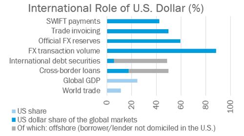 The Bretton Woods and the petrodollar system helped lay the foundation for the U.S. dollar. The U.S. dollar plays a critical role in global capital markets and the world economy today. The dollar is pivotal in foreign exchange (FX) trade volume, SWIFT payments, trade invoicing, official FX reserves, international debt securities, and cross-border loans as shown in Figure 4.