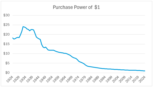 Another concern, not extensively discussed in this paper but central to public discourse, is inflation. The graph below illustrates the declining purchasing power of the dollar since the 1930s. For context, $1 today would have been able to purchase $18 worth of goods 100 years ago in 1924, reflecting a steady erosion of value over time (see Figure 7). This has led many to question the dollar’s effectiveness as a store of value, prompting interest in alternative currencies or assets. Bitcoin and other digital currencies are often cited as potential solutions, but widespread adoption of digital currencies still seems to be a distant prospect.