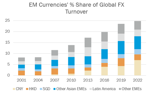 According to the International Monetary Fund (IMF), the combined GDP of emerging market economies was recorded at $45.1 trillion as of April 2023, a significant rise from approximately $8 trillion two decades ago using World Bank data. By comparison, U.S. GDP has grown from approximately $11 trillion to $26 trillion over the same period. The rapid growth of EM economies has naturally translated into a larger market share for their currencies in global foreign exchange (FX) transactions. The accompanying chart below illustrates the increasing share of EM currencies in FX trading over time.